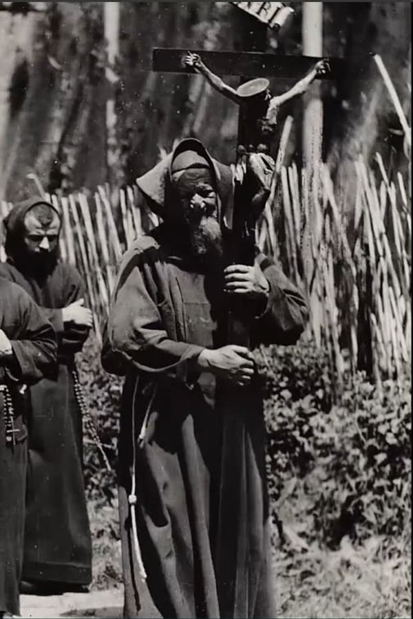 A group of monks in procession carrying a large crucifix in Vatican City, 1898.